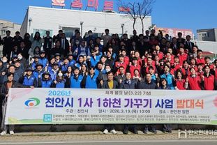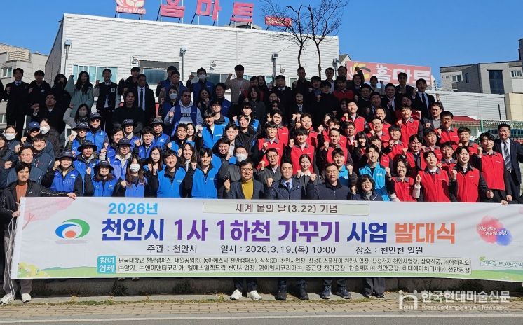 한국현대미술신문 신정은 기자 | 천안시는 세계 물의 날(3월 22일)을 기념해 19일 천안천 일원에서 ‘2026년 1사 1하천 가꾸기 사업’ 발대식을 개최하고 하천 정화활동을 진행했다.