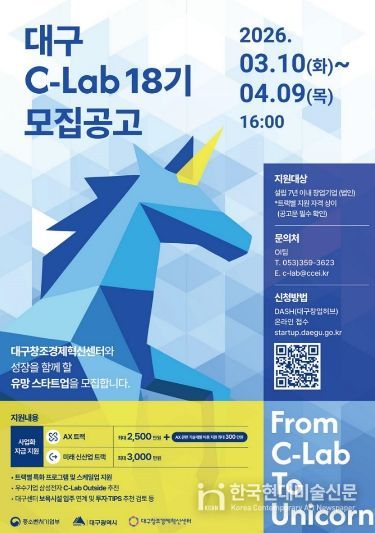 한국현대미술신문 정소영 기자 | 대구광역시는 인공지능 전환(AX)을 선도할 혁신 기술 기업과 대구의 미래 전략 신산업을 이끌 유망 스타트업을 발굴하기 위해 ‘대구 C-Lab 액셀러레이팅 18기’ 참여기업을 오는 4월 9일까지 모집한다.