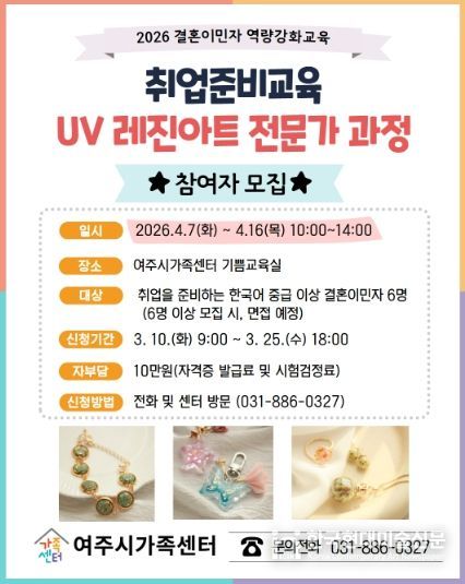 이번 교육은 취업을 희망하는 결혼이민자들이 자신의 적성과 관심 분야를 탐색하고 실질적인 취업 준비 역량을 키울 수 있도록 다양한 과정으로 구성됐다. 주요 교육 과정은 ▲UV 레진아트 전문가 과정 ▲의료통번역사 자격 취득 과정 ▲운전면허 필기(학과)반 ▲취업 기초소양교육으로 운영될 예정이다.
