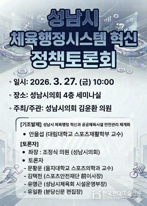 한국현대미술신문 배윤섭 기자 | 성남시의회 김윤환 의원(문화복지체육위원회)은 오는 27일, 성남시 체육행정의 혁신 방향을 모색하기 위한 '성남시 체육행정시스템 혁신 정책토론회'를 개최한다고 밝혔다.