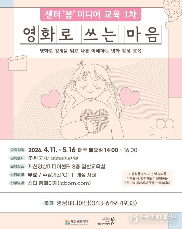 한국현대미술신문 신정은 기자 | 제천문화재단이 24일부터 영화 감상 인문학 교육 [영화로 쓰는 마음]의 수강생을 모집한다.