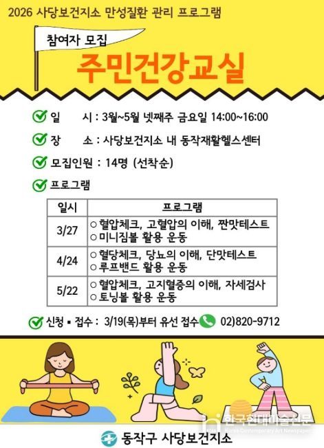 아울러 주민건강교실은 대사증후군 등록관리 대상자 및 지역주민을 대상으로 사당보건지소 내 동작재활헬스센터(사당로253-3)에서 운영된다.