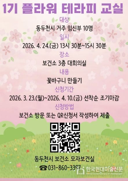 이번 플라워테라피 태교 교실은 4월 24일 보건소 3층 대회의실에서 진행하며 신청 기간은 오는 10일까지로 동두천시 보건소에 등록된 임신부를 선착순 모집한다.