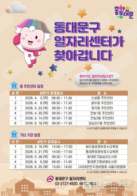 한국현대미술신문 배건 기자 | 서울 동대문구는 지난해에 이어 올해도 현장 중심 취업 지원 서비스인 '찾아가는 일자리상담소'를 운영한다고 밝혔다.