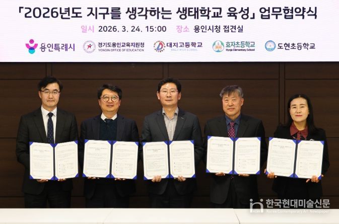 한국현대미술신문 배윤섭 기자 | 용인특례시는 24일 시청 접견실에서 용인교육지원청을 비롯해 3개 학교와 ‘지구를 생각하는 생태학교 육성사업’을 위한 협약을 맺었다.