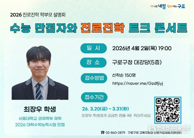 한국현대미술신문 배건 기자 | 구로구가 오는 4월 2일 구로구청 대강당에서 ‘2026 수능 만점자와 진로진학 토크콘서트’를 개최한다.