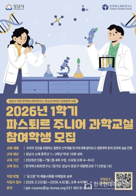 한국현대미술신문 배윤섭 기자 | 성남시는 2026년 상반기 한국파스퇴르연구소 ‘파스퇴르 주니어 과학교실’ 참여 학생을 모집한다.
