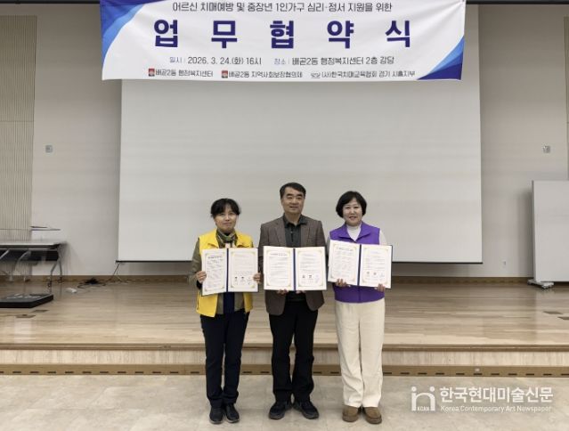 한국현대미술신문 배윤섭 기자 | 시흥시 배곧2동 행정복지센터는 지난 3월 24일 행정복지센터 2층 강당에서 배곧2동 지역사회보장협의체, (사)한국치매교육협회 경기 시흥지부와 ‘어르신 치매예방 및 중장년 1인 가구 정서 지원을 위한 업무협약’을 체결했다.
