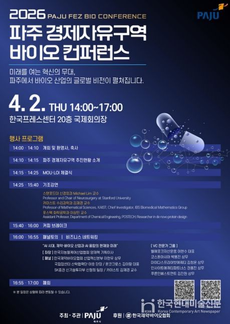 한국현대미술신문 배윤섭 기자 | 파주시는 오는 4월 2일 14시, 서울 중구 한국프레스센터 국제회의장에서 녪파주 경제자유구역 바이오 컨퍼런스’를 개최한다.