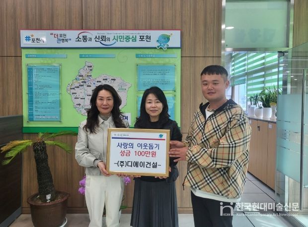 한국현대미술신문 배윤섭 기자 | 포천시 신읍동 소재 ㈜디에이건설은 지난 24일 지역 내 어려운 이웃을 돕기 위해 가산면 행정복지센터에 성금 100만 원을 기탁했다.