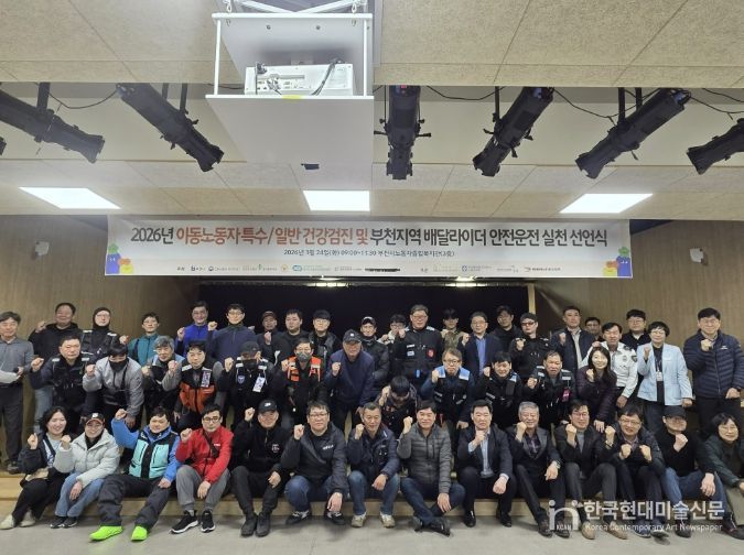한국현대미술신문 배윤섭 기자 | 부천시는 지난 24일 부천시노동자종합복지관에서 이륜차 사고 예방과 안전한 배달문화 정착을 위해 ‘2026년 이동노동자 건강검진 및 부천지역 배달 라이더 안전운전 실천 선언식’을 열었다.