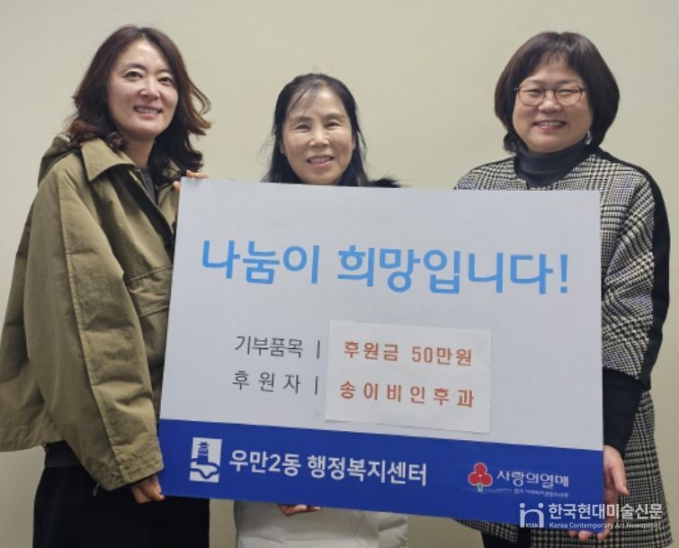 한국현대미술신문 배윤섭 기자 | 수원시 팔달구 우만2동은 지난 24일, 송이비인후과으로부터 취약계층 지원을 위한 이웃돕기 후원금 50만 원을 기탁받았다고 밝혔다.