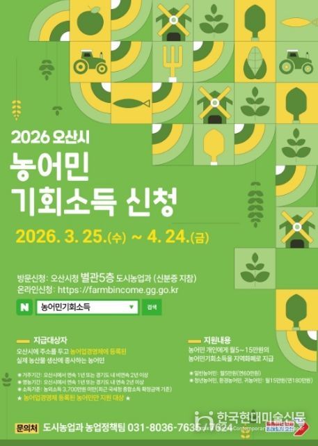 한국현대미술신문 배윤섭 기자 | 오산시는 농업·농촌의 공익적 가치 보장과 농어촌 소멸위기 대응을 위해 ‘2026년 농어민 기회소득’ 신청·접수를 3월 25일부터 4월 24일까지 진행한다고 밝혔다.