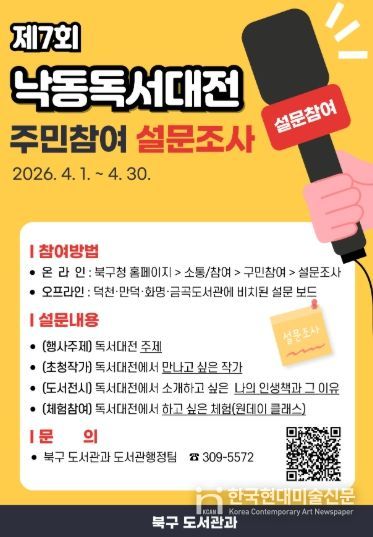 한국현대미술신문 정소영 기자 | 부산 북구는 오는 4월 1일부터 30일까지 한 달간 2026년 제7회 낙동독서대전 개최를 위한 구민 의견수렴 설문조사를 실시한다고 밝혔다.