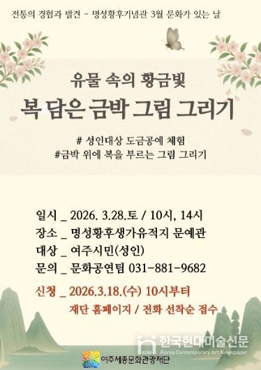 한국현대미술신문 배윤섭 기자 | 여주세종문화관광재단은 오는 3월 28일, 명성황후기념관 3월 문화가 있는 날 프로그램으로 '유물 속의 황금빛, 복 담은 금박 그림 그리기'를 진행한다.