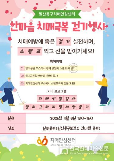한국현대미술신문 배윤섭 기자 | 고양특례시 일산동구보건소 치매안심센터에서는 치매에 대한 사회적 공감대 형성 및 치매 친화적 사회를 조성하고자 한마음 치매극복 걷기 행사를 오는 4월 8일 백석동 알미공원(일산동구 중앙로 1087-2)에서 진행한다.