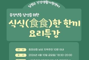 한국현대미술신문 원진 기자 | 남원주건강생활지원센터는 영양 교육 및 건강 요리 실습 기회가 적은 중장년 남성을 위한 ‘식식(食食)한 한끼’ 프로그램 참여자를 모집한다.