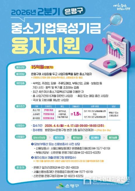 한국현대미술신문 배건 기자 | 서울 은평구는 관내 중소기업과 소상공인의 경영 안정을 위해 15억 원 규모의 2026년 2분기 중소기업육성기금 융자를 시행한다고 밝혔다.