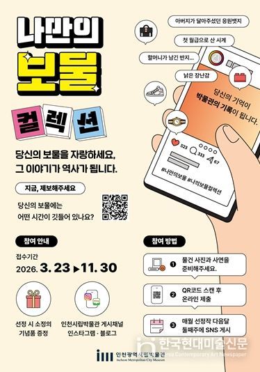 접수는 11월 30일까지 상시 진행되며, 인천시립박물관은 매월 접수된 사연 가운데 우수작을 선정해 ‘나만의 보물 컬렉션’ 카드뉴스로 제작하고 공식 사회관계망서비스(SNS)에 게시할 계획이다. 또한 사연이 채택된 시민에게는 박물관 기념 컵을 증정한다.