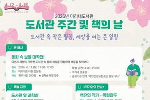 한국현대미술신문 원진 기자 | 원주시 미리내도서관은 2026년 도서관 주간 및 책의 날을 기념해 4월 11일부터 25일까지 ‘도서관 속 작은 펼침, 세상을 여는 큰 열림’을 주제로 다채로운 문화 프로그램을 선보인다.