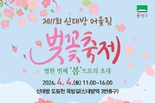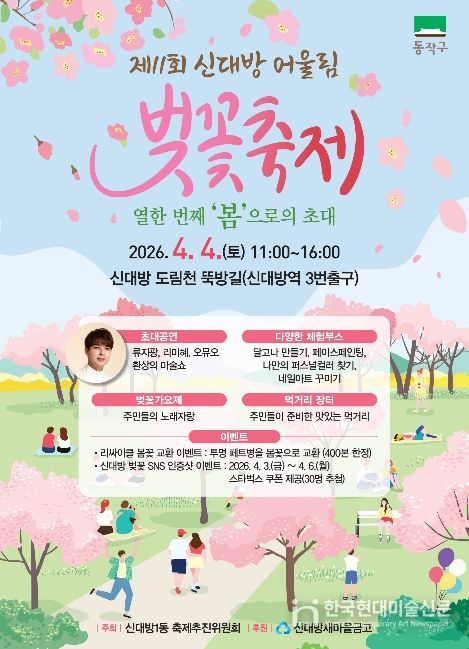 먼저, 올해로 11회째를 맞는 ‘신대방 어울림 벚꽃축제’는 오전 11시부터 오후 4시까지 신대방역 3번 출구 인근 도림천 뚝방길에서 열린다.
