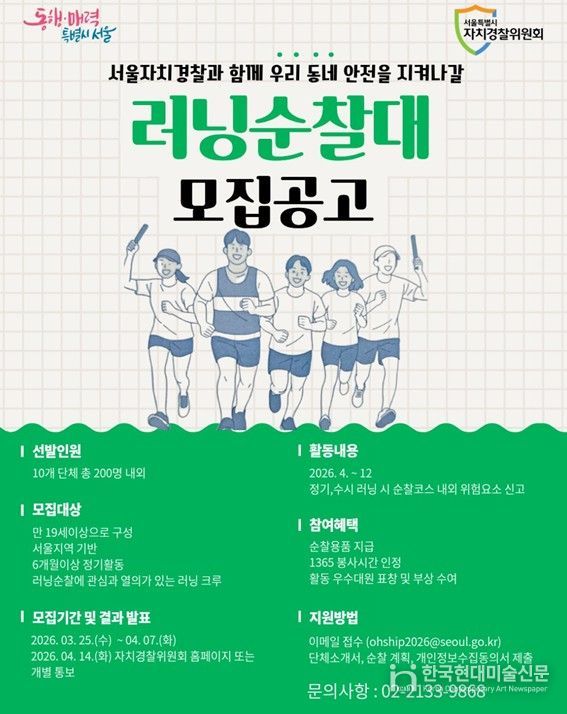 한국현대미술신문 배건 기자 | 서울시 자치경찰위원회는 러닝을 하며 동네 안전까지 함께 살피는 시민 참여형 활동인 서울 러닝 순찰대에 참여할 2026년 신규 대원을 모집한다. 올해는 10개 단체(크루) 200명 규모로 확대해 운영할 계획이다.