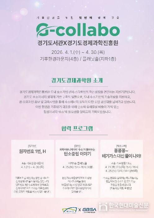 한국현대미술신문 배윤섭 기자 | 경기도서관은 수소 에너지를 널리 알리기 위해 4월 한 달간 경기도경제과학진흥원과 협업프로젝트를 운영한다고 1일 밝혔다. 전시와 강좌, 체험을 연계한 프로그램을 통해 수소산업과 탄소중립에 대한 인식을 확산하는 것이 목적이다.