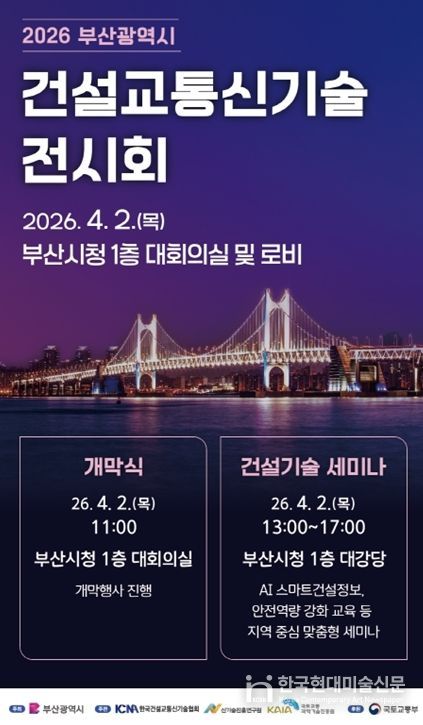 한국현대미술신문 정소영 기자 | 부산시는 우수 건설 신기술 홍보와 활용을 촉진하고 지역 중소기업의 성장동력을 지원하기 위해 오늘(2일) 오전 10시부터 오후 5시까지 시청 1층 대회의실과 로비에서 '2026년 부산광역시 건설교통신기술 전시회'를 개최한다고 밝혔다.