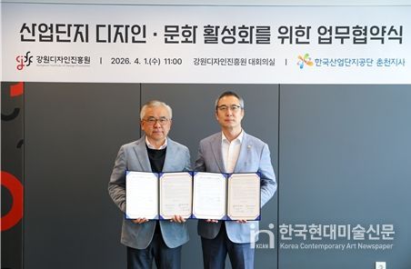 한국현대미술신문 원진 기자 | 강원디자인진흥원은 1일 강원디자인진흥원 대회의실에서 한국산업단지공단 강원지역본부 춘천지사와 산업단지 내 디자인·문화 활성화를 위한 공동사업 추진 업무협약을 체결했다고 밝혔다.