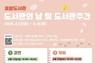 한국현대미술신문 신정은 기자 | 충주시 호암도서관은 제4회 ‘도서관의 날’과 제62회 ‘도서관주간’을 맞아 4월 12일부터 18일까지 7일간 다채로운 독서문화 행사를 운영한다고 2일 밝혔다.