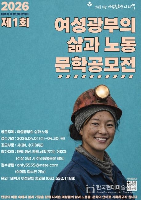한국현대미술신문 원진 기자 | 태백시 여성단체협의회(회장 김미숙)는 오는 4월 1일부터 30일까지 '2026년 여성광부의 삶과 노동' 문학 공모전을 개최한다고 밝혔다.