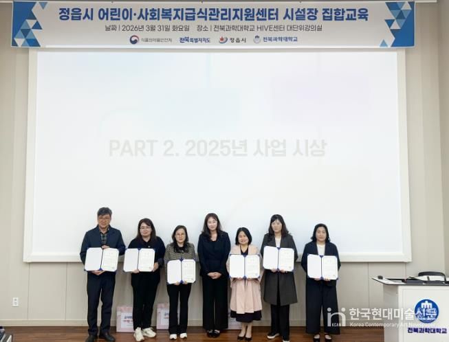 한국현대미술신문 기자 | 정읍시 어린이·사회복지급식관리지원센터가 지난달 31일 전북과학대학교 하이브(HIVE)센터에서 관내 어린이 급식소 시설장 90여 명을 대상으로 ‘2026년 사업설명회 및 어린이 식생활 교육’을 개최했다.
