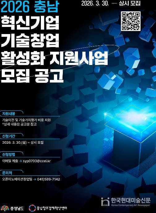 한국현대미술신문 신정은 기자 | 충남창조경제혁신센터가 지역 창업기업의 기술 경쟁력을 높이고 성공적인 사업화를 돕기 위해 ‘2026년 충남 혁신기업 기술창업 활성화 지원사업’을 시행하고 참여 기업을 모집한다고 밝혔다.