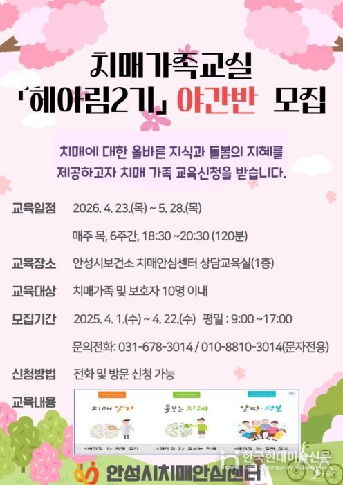 한국현대미술신문 배윤섭 기자 | 안성시보건소 치매안심센터가 직장이나 생업으로 낮시간대 교육받기 어려운 치매환자 가족을 위하여 오는 23일부터 가족교실 야간반을 운영한다.