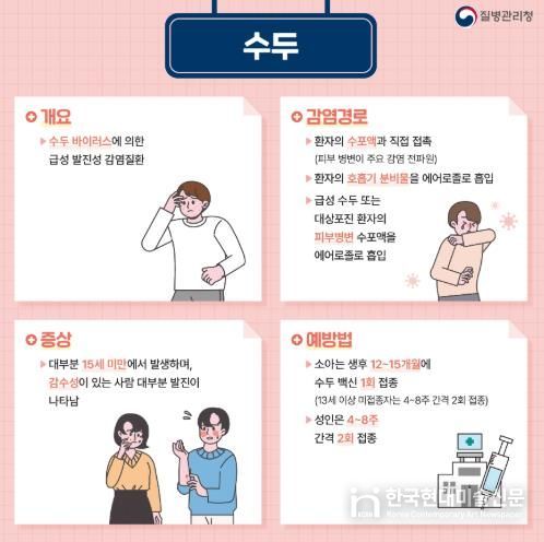 수두와 유행성이하선염은 환자가 기침할 때 나오는 침방울 등 호흡기 분비물을 통해 전파되는 대표적인 감염병이다.