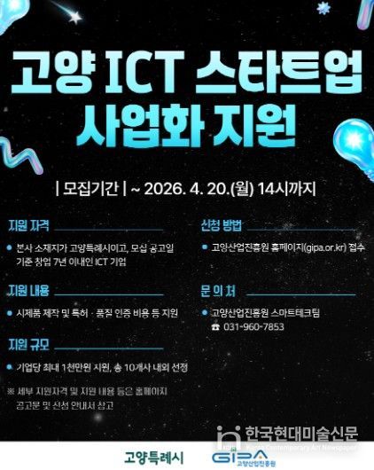 한국현대미술신문 배윤섭 기자 | 고양산업진흥원이 ‘2026년 고양 ICT 스타트업 사업화 지원사업’ 참여 기업을 모집한다.