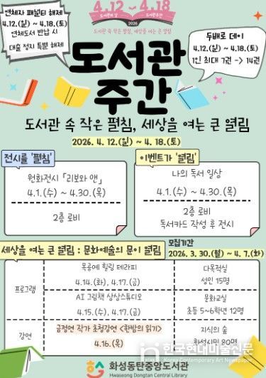 한국현대미술신문 배윤섭 기자 | 화성동탄중앙도서관은 지난해 11월 3일 개관 이후 처음 맞이하는 도서관주간을 기념해 시민들이 다양한 독서·문화생활을 즐길 수 있도록 도서관주간 특별 프로그램을 운영한다고 밝혔다.