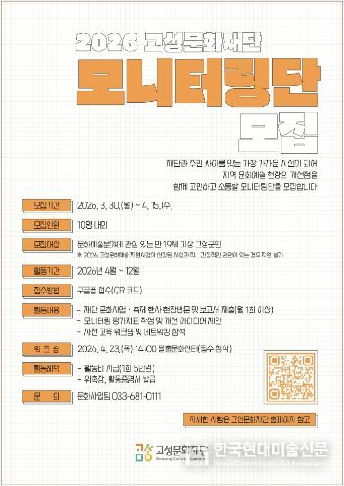 한국현대미술신문 원진 기자 | 평화 경제 거점 도시 강원 고성군 산하 고성문화재단은 재단이 추진하는 문화예술사업에 대한 군민 의견을 반영하고 사업 환류 체계를 강화하기 위해 ‘2026 고성문화재단 모니터링단’을 모집한다. 이번 사업은 군민 참여 기반의 현장 소통을 확대하고, 문화예술사업 운영의 투명성과 책임성을 높이기 위해 마련됐다.
