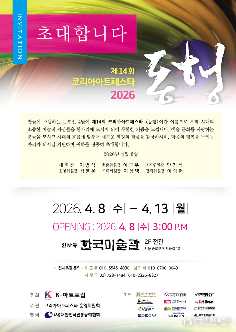 전시는 4월 8일 부터 13일까지 한국미술관 2층 전관에서 진행되며, 행사 기간 동안 수준 높은 작품들과 함께 깊이 있는 예술적 경험을 제공할 예정이다.
