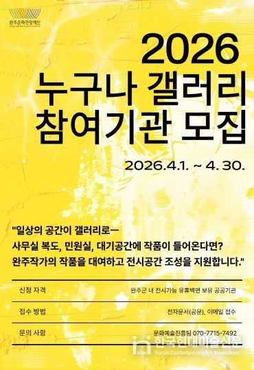 한국현대미술신문 기자 | (재)완주문화관광재단은 관내 소장품을 활용하여 군민들의 일상 생활권 내 전시 활성화를 도모하는 '2026 누구나 갤러리 : 완주 작가 작품 대여‧전시'참여기관을 오는 4월 30일까지 모집한다고 밝혔다.