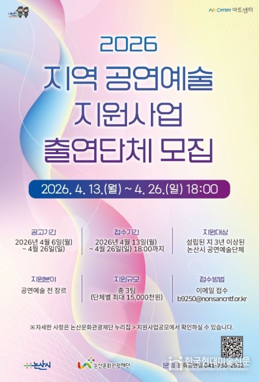 선정단체는 논산아트센터에서 1회 공연을 진행하게 되며, 신청은 4월 13일부터 4월 26일 18시까지이다.