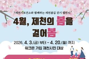 보건소 관계자는 “따뜻한 봄을 맞아 시민들이 일상에서 걷기를 실천할 수 있도록 봄을 주제로 한 워크온 챌린지를 기획했다”며 “아름다운 제천의 봄길을 걸으며 건강까지 챙길 기회가 될 것”이라고 말했다.
