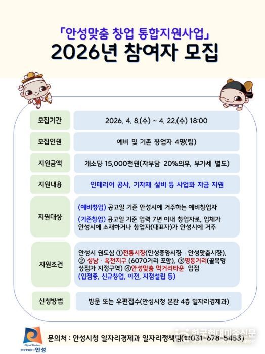 한국현대미술신문 배윤섭 기자 | 안성시는 오는 4월 8일 수요일부터 22일 수요일까지 ‘2026년 안성맞춤 창업 통합지원사업’ 참여자를 모집한다. 이번 사업은 전통시장과 골목상권에 창업을 유도함으로써 지역 상권을 활성화하고, 이를 차세대 문화·관광 자원으로 발전시키기 위해 기획됐다.