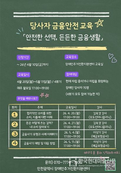 한국현대미술신문 박재남 기자 | 인천시사회서비스원 소속 인천시장애인주거전환지원센터는 당사자 금융 안전교육 ‘안전한 선택, 든든한 금융 생활’ 참가자를 모집한다고 6일 밝혔다.