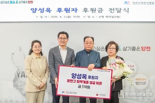 이기재 양천구청장은 “평생 땀 흘려 일하며 모은 소중한 재산을 어려운 이웃과 우리 아이들을 위해 선뜻 내어주신 양성옥 어르신의 숭고한 결단에 깊은 존경과 감사를 드린다”며 “기부자님의 따뜻한 마음이 헛되지 않도록 성금을 투명하고 책임 있게 집행하겠다”고 말했다.