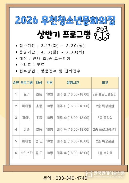 한국현대미술신문 원진 기자 | 우천청소년문화의집에서 우천 지역 청소년들을 위한 상반기 프로그램을 시작한다.
