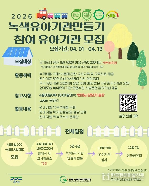 한국현대미술신문 배윤섭 기자 | 경기도가 아이들이 생활 속에서 올바른 녹색 소비 습관을 가질 수 있도록 돕는 ‘2026년 녹색유아기관만들기’ 참여 기관 200곳을 4월 13일까지 모집한다.