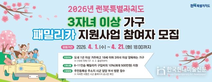 한국현대미술신문 기자 | 정읍시가 다자녀 가구의 경제적 부담을 덜고 저출생 위기를 극복하기 위해 관내 3자녀 이상 가구를 대상으로 최대 500만원의 가족용 차량(패밀리카) 구매 비용을 지원한다.