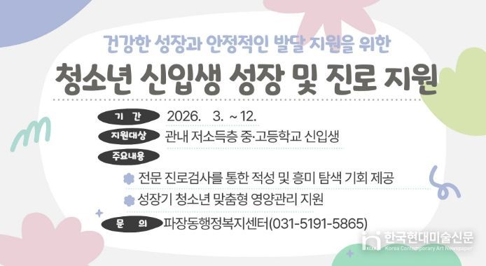 한국현대미술신문 배윤섭 기자 | 수원시 장안구 파장동은 진로탐색 기회가 부족한 저소득층 청소년을 위해 ‘청소년 신입생 성장·진로 지원사업’을 추진한다고 밝혔다.
