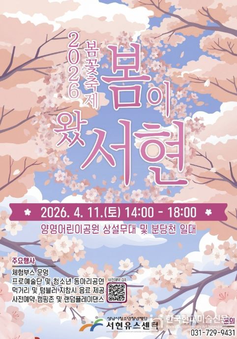 한국현대미술신문 배윤섭 기자 | 성남시청소년청년재단 서현유스센터는 4월 11일 14시부터 18시까지 양영어린이공원 일대에서 ‘제7회 청.마.닮’ 봄꽃축제 『봄이 왔서현!』을 개최한다.